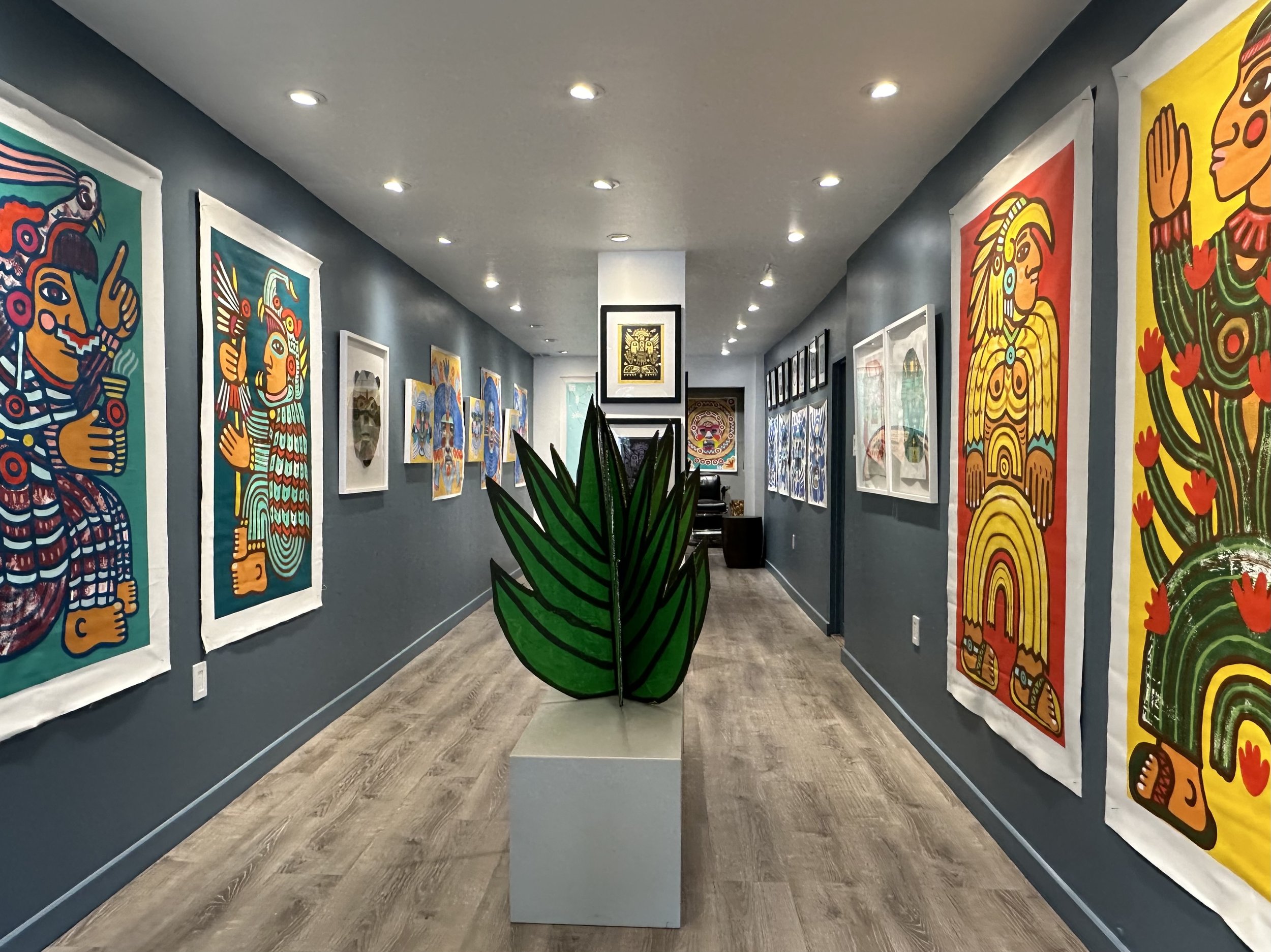 The show Símbolos Mágicos is a body of mixed media work, which honors symbols, history, culture, and identity. The work showcases various techniques that span the past 3 years of work that Rayos Magos has built as a full time artist. The work on display engages audience members with the vibrant colors, textures, and shapes. The theme of the show focuses on the magic of symbols and archetypes, which connects us to ancient and ancestral history. The hope is to build a visual language that is bold, narrative, emotive, and contemporary. In working with symbols he hopes to create a visual language of meaning and storytelling. His intention is to conjure up distant memories of the past in order to bring them to the present and remind us where we have come from and where we are heading. (See more after gallery of Exhibition Works)